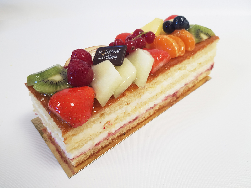 Een klassieke schnitte met belegd met verse vruchten en een vulling van slagroom en een laagje frambozen puree
